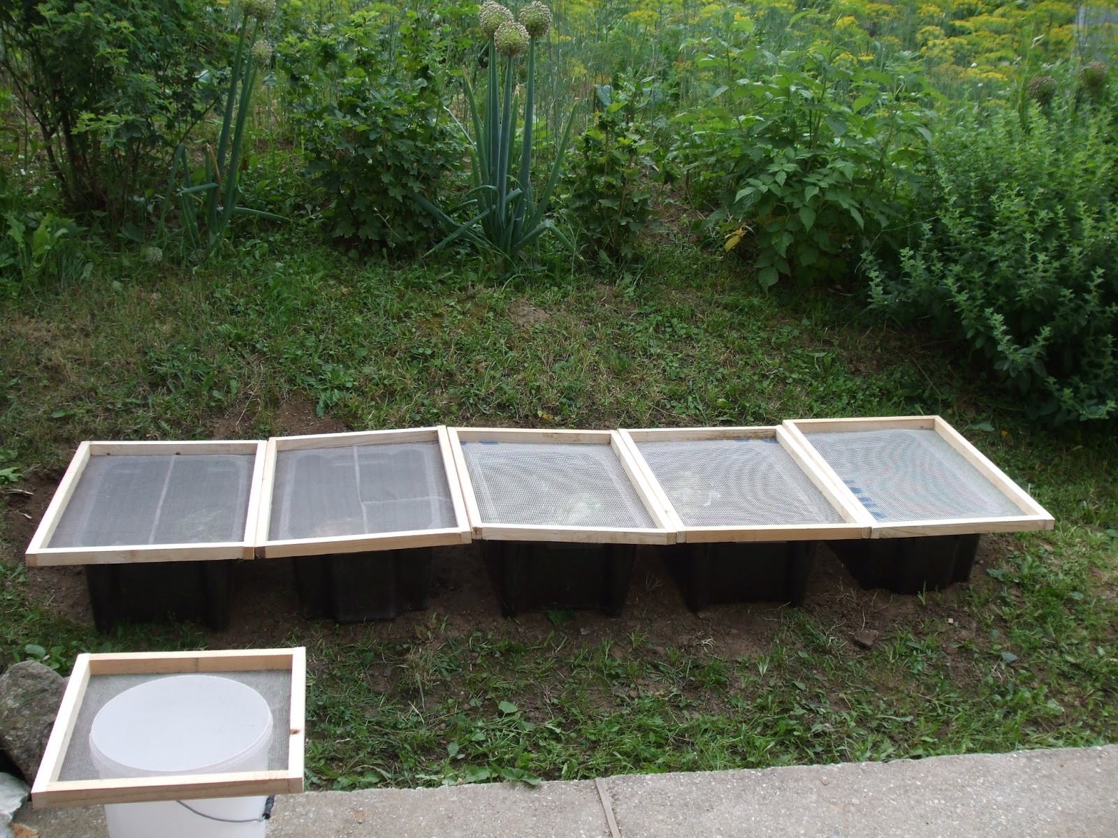 Legelőbb hadd osztom meg veletek azt az érzésemet,hogy nagyon tetszik...tetszik amit a képen látok!:)A földet kissé elplaníroztam a ládák alatt,elkészültek a tetők is,az egésznek mostantól van olyan kinézete hogy látni lehet:komolyan gondolom,és módom volt időt is szánni elképzeléseimre.Mint látod olvasóm két különböző sűrűségű hálót alkalmaztam az egyszerű léckereteken-mondanom sem kell hogy nem véletlenül!A két bal oldalin maradék szúnyogháló van tűzőgéppel felerősítve,míg a következő három láda tetején az ún. Dryvit üvegszövet hálót alkalmaztam ugyancsak tűzőgéppel alulról felerősítve.Nem véletlen hogy nagyobbak a keretek mint a ládák....minden irányban ~3cm-el tágasabb a keret mint a ládák befoglaló méretei-erre azért van szükség hogy ne a keret,hanem maga a háló feküdjön fel a ládák szélein.A láda ugyanis a kerettel egyetemben lehet kissé deformálódott,így a merev keret nem takarna kielégítően-a hálóknak szerepük van!Megjelentek ugyanis a vízre szomjazó darazsak,eleddig 6 fajt azonosítottam be a fürkészdarazsakig bezáróan...veszélyes dolog a közelükben hálózgatni,a lódarazsak közelsége pedig egyszerűen életveszélyes is lehet!Egyik hajnalon cickány srácot mentettem a vízből,egy másik napon pedig a vízből kievickélni képtelen cincérnek segítettem tovább élni...de a csigák is hagytak "névjegyet"némi ürülék formájában-kelletek hát a tetők.